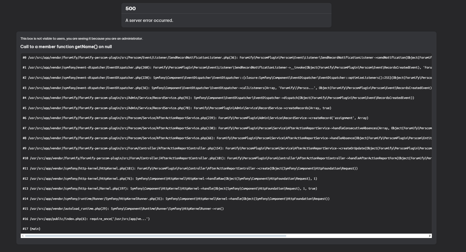 #0 /usr/src/app/vendor/forumify/forumify-perscom-plugin/src/Perscom/Event/Listener/SendRecordNotificationListener.php(36): Forumify\PerscomPlugin\Perscom\Event\Listener\SendRecordNotificationListener->sendNotification(Object(Forumify\PerscomPlugin\Perscom\Entity\Record\AssignmentRecord)) #1 /usr/src/app/vendor/symfony/event-dispatcher/EventDispatcher.php(260): Forumify\PerscomPlugin\Perscom\Event\Listener\SendRecordNotificationListener->__invoke(Object(Forumify\PerscomPlugin\Perscom\Event\RecordsCreatedEvent), 'Forumify\\Persco...', Object(Symfony\Component\EventDispatcher\EventDispatcher)) #2 /usr/src/app/vendor/symfony/event-dispatcher/EventDispatcher.php(220): Symfony\Component\EventDispatcher\EventDispatcher::{closure:Symfony\Component\EventDispatcher\EventDispatcher::optimizeListeners():255}(Object(Forumify\PerscomPlugin\Perscom\Event\RecordsCreatedEvent), 'Forumify\\Persco...', Object(Symfony\Component\EventDispatcher\EventDispatcher)) #3 /usr/src/app/vendor/symfony/event-dispatcher/EventDispatcher.php(56): Symfony\Component\EventDispatcher\EventDispatcher->callListeners(Array, 'Forumify\\Persco...', Object(Forumify\PerscomPlugin\Perscom\Event\RecordsCreatedEvent)) #4 /usr/src/app/vendor/forumify/forumify-perscom-plugin/src/Admin/Service/RecordService.php(91): Symfony\Component\EventDispatcher\EventDispatcher->dispatch(Object(Forumify\PerscomPlugin\Perscom\Event\RecordsCreatedEvent)) #5 /usr/src/app/vendor/forumify/forumify-perscom-plugin/src/Admin/Service/RecordService.php(70): Forumify\PerscomPlugin\Admin\Service\RecordService->createRecords(Array, true) #6 /usr/src/app/vendor/forumify/forumify-perscom-plugin/src/Perscom/Service/AfterActionReportService.php(239): Forumify\PerscomPlugin\Admin\Service\RecordService->createRecord('assignment', Array) #7 /usr/src/app/vendor/forumify/forumify-perscom-plugin/src/Perscom/Service/AfterActionReportService.php(130): Forumify\PerscomPlugin\Perscom\Service\AfterActionReportService->handleConsecutiveAbsences(Array, Object(Forumify\PerscomPlugin\Perscom\Entity\AfterActionReport)) #8 /usr/src/app/vendor/forumify/forumify-perscom-plugin/src/Perscom/Service/AfterActionReportService.php(66): Forumify\PerscomPlugin\Perscom\Service\AfterActionReportService->handleAbsence(Object(Forumify\PerscomPlugin\Perscom\Entity\AfterActionReport)) #9 /usr/src/app/vendor/forumify/forumify-perscom-plugin/src/Forum/Controller/AfterActionReportController.php(154): Forumify\PerscomPlugin\Perscom\Service\AfterActionReportService->createOrUpdate(Object(Forumify\PerscomPlugin\Perscom\Entity\AfterActionReport), '{"absent":["13"...', true) #10 /usr/src/app/vendor/forumify/forumify-perscom-plugin/src/Forum/Controller/AfterActionReportController.php(101): Forumify\PerscomPlugin\Forum\Controller\AfterActionReportController->handleAfterActionReportForm(Object(Forumify\PerscomPlugin\Perscom\Entity\AfterActionReport), true, Object(Symfony\Component\HttpFoundation\Request)) #11 /usr/src/app/vendor/symfony/http-kernel/HttpKernel.php(181): Forumify\PerscomPlugin\Forum\Controller\AfterActionReportController->create(Object(Symfony\Component\HttpFoundation\Request)) #12 /usr/src/app/vendor/symfony/http-kernel/HttpKernel.php(76): Symfony\Component\HttpKernel\HttpKernel->handleRaw(Object(Symfony\Component\HttpFoundation\Request), 1) #13 /usr/src/app/vendor/symfony/http-kernel/Kernel.php(197): Symfony\Component\HttpKernel\HttpKernel->handle(Object(Symfony\Component\HttpFoundation\Request), 1, true) #14 /usr/src/app/vendor/symfony/runtime/Runner/Symfony/HttpKernelRunner.php(35): Symfony\Component\HttpKernel\Kernel->handle(Object(Symfony\Component\HttpFoundation\Request)) #15 /usr/src/app/vendor/autoload_runtime.php(29): Symfony\Component\Runtime\Runner\Symfony\HttpKernelRunner->run() #16 /usr/src/app/public/index.php(6): require_once('/usr/src/app/ve...') #17 {main}