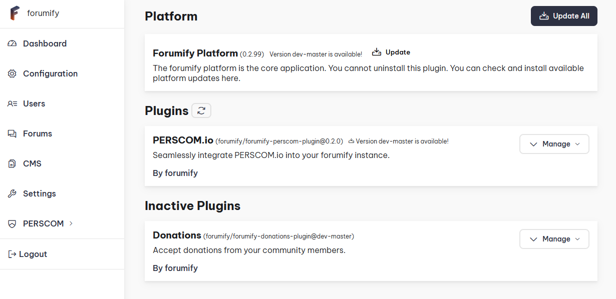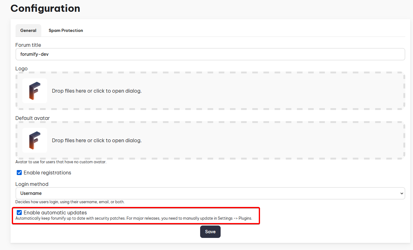To make maintenance easier, we've introduced automatic updates for both plugins and the platform for minor versions. This feature ensures that your forumify instance stays up-to-date with the latest enhancements and security fixes without manual intervention.