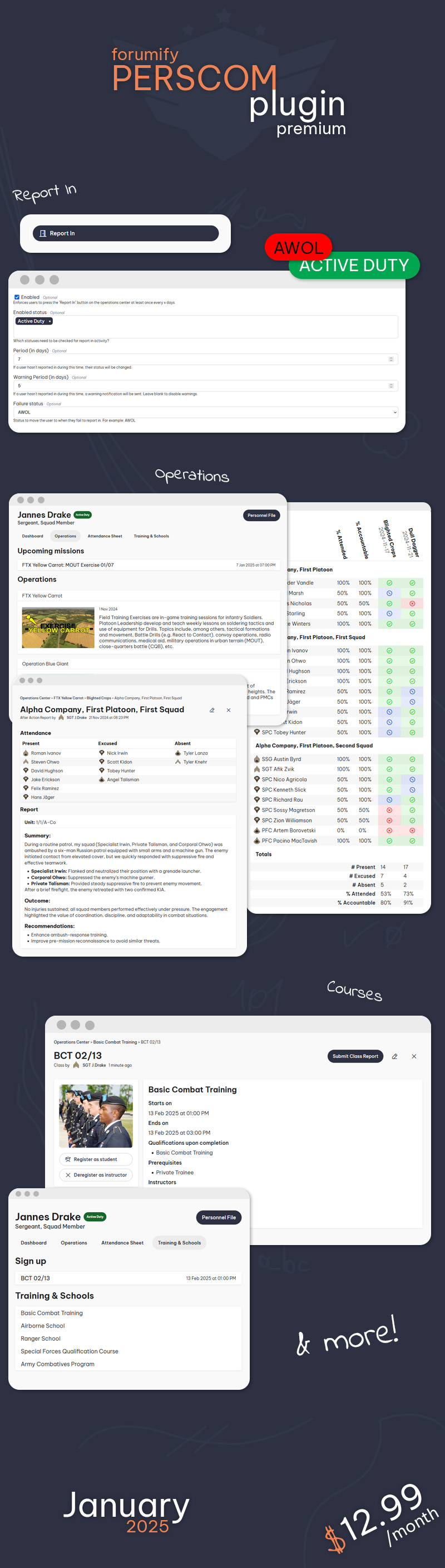 This version of the plugin will bring back some of the beloved features of the Invision Community version of PERSCOM, as well as introducing some new modules. So time to bury those spreadsheets, save your staff hundreds of hours filing records and updates, it's time for the new generation of personnel management tools to fully replace the old.